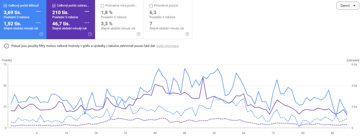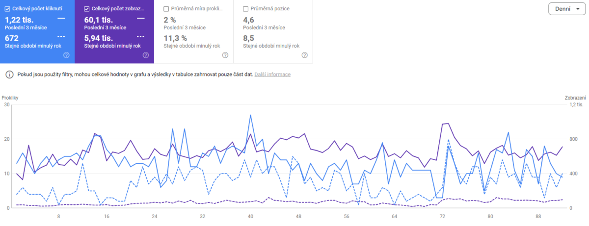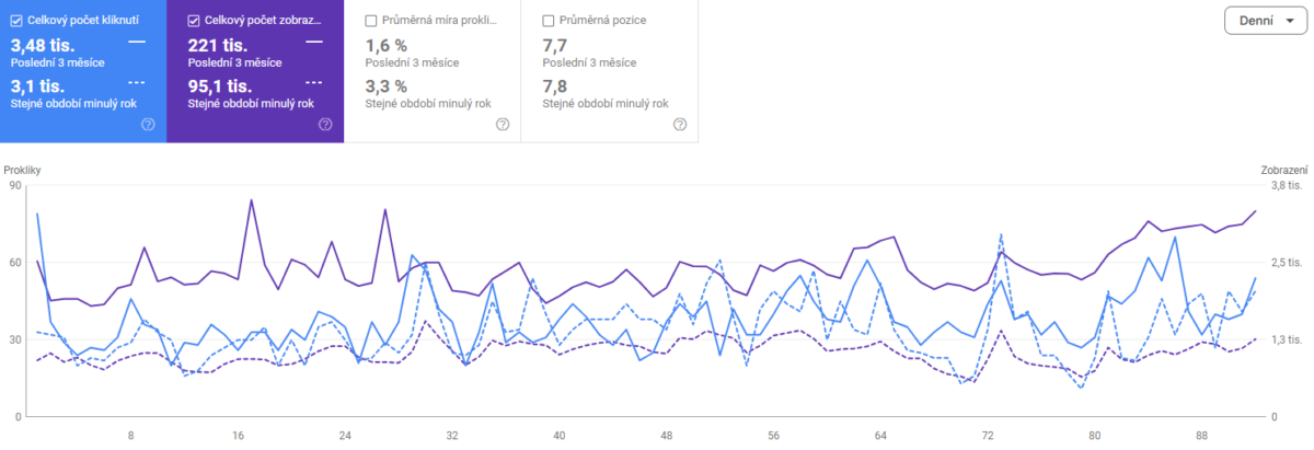 Podobný postup, upravený na míru klientovi i tématu, jsme aplikovali i na další naše klienty. V tomto konkrétním případě nám roční práce na blogové sekci s cyklistickou tématikou přinesla nárůst v proklicích o 102 %. Srovnání je za poslední 3 měsíce YoY.