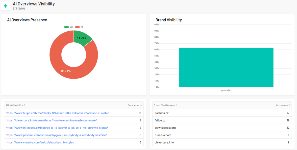 V AI Mode v našem sledovaném datasetu je web Pashmii.cz mezi nejcitovanějšími zdroji. Na většinu dotazů jsme pak do TOP 10 výsledků. Podobně je tomu i v AIO, kde ale ne u všech dotazů jsou ve vyhledávání odpovědi pomocí AIO zobrazovány. Dataset obsahuje zhruba 200 hlavních dotazů, jelikož téma kašmíru je spíše úzce zaměřené.