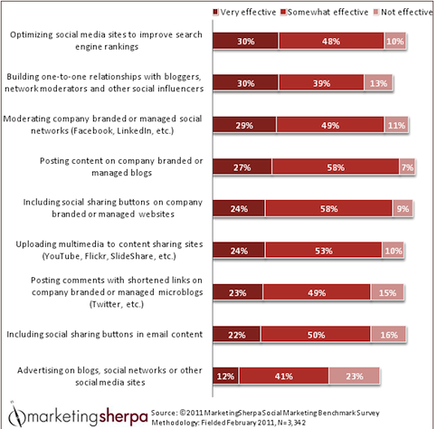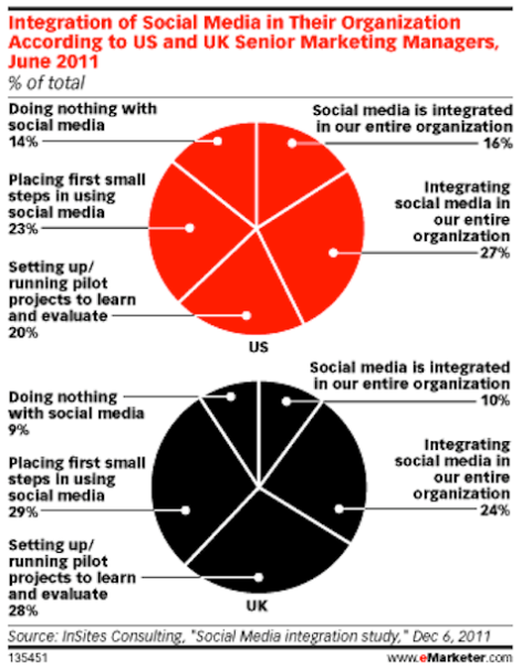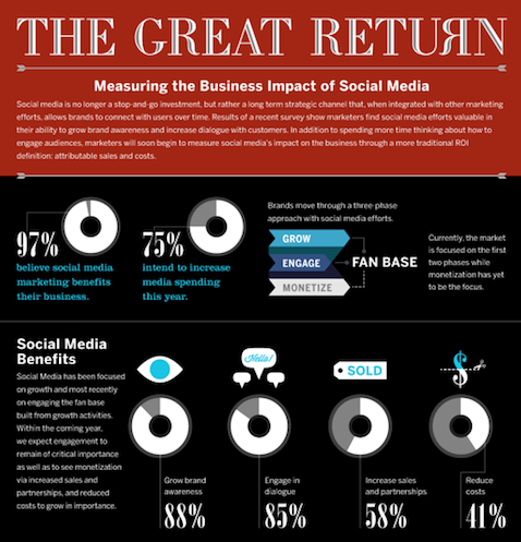 Na vzorku 700 marketérů z celého světa se ukázalo, že prakticky všichni uznávají, že sociální média jsou pro marketing výhodná, a že má smysl s nimi pracovat. Tři čtvrtě z nich pak navíc potvrdilo, že v roce 2012 plánují navýšit investice v tomto oboru. Když bychom se podívali na výhody, které nejčastěji zmiňovali, tak to byla především možnost zvýšit povědomí o značce a komunikovat přímo se zákazníkem.