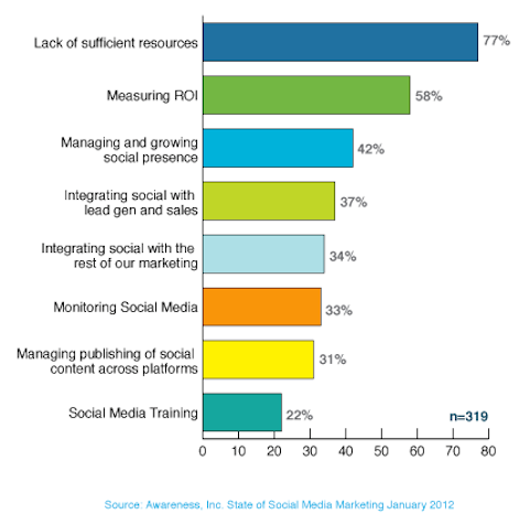 Když se podíváme na největší problémy, které firmy v souvislosti se sociálním marketingem zmiňují, tak to je především nedostatek zdrojů, a pochopitelně také obtížné měření ROI (návratnosti investic).