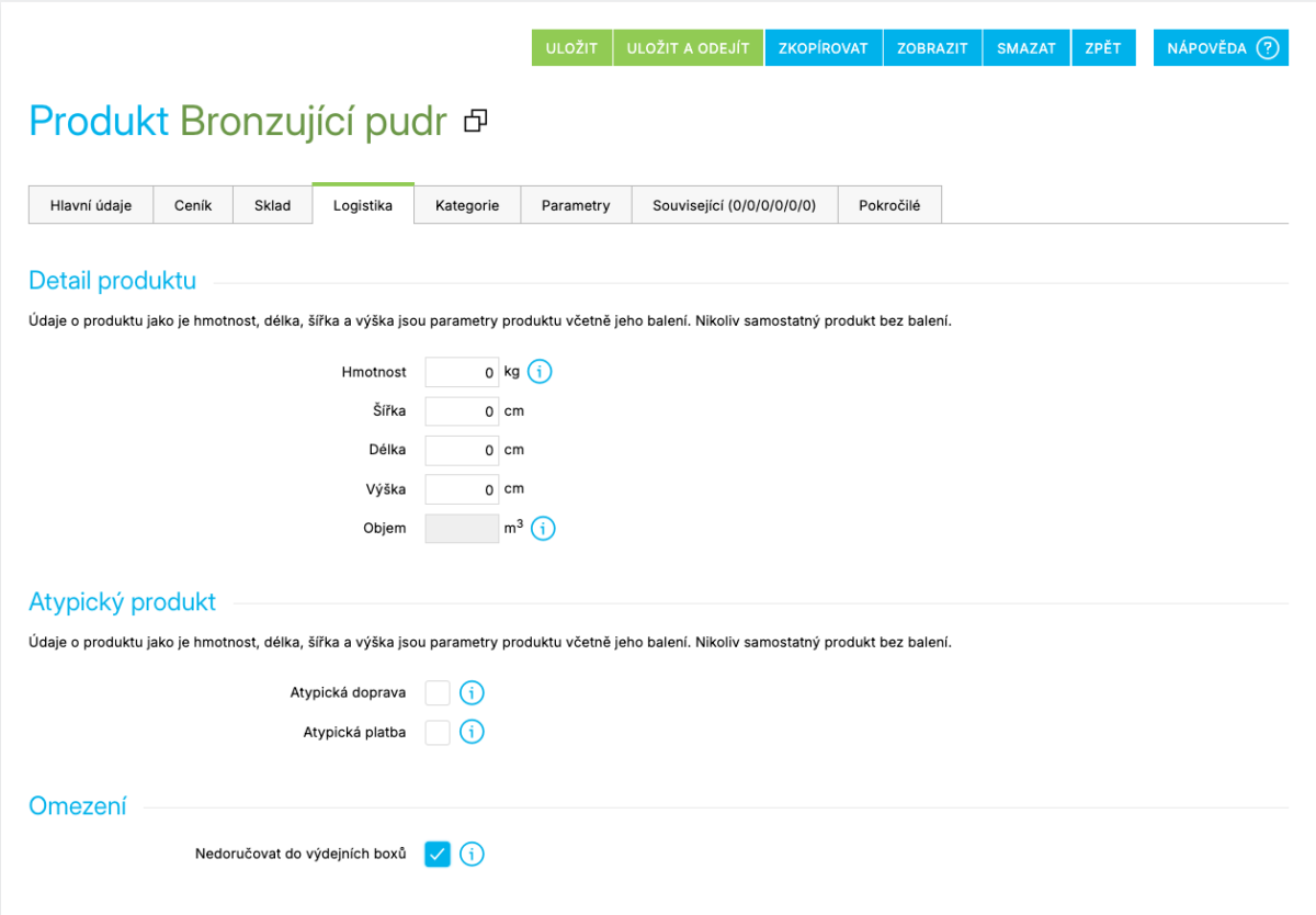 Nastavení najdete na záložce Logistika na detailu produktu. Je vhodné např. pro produkty, které jsou lehké, ale do boxu se nevejdou. U partnerských doplňků, které nabízejí boxy ve svých widgetech, je nutná implementace ze strany partnera. Může se tak stát, že tento druh widgetu bude stále nabízet možnost zvolení boxu. Pokud máte nasazené své vlastní úpravy, informaci o nedostupnosti doručení do boxu najdete v datech košíku.