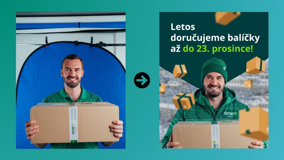 Před Vánoci jsme narychlo potřebovali fotku kurýra v zimním oblečení, ale žádnou jsme neměli k dispozici. Využili jsme proto Nano Banana Pro a během pár minut jsme si obrázek vygenerovali (ostatní prvky už jsou práce grafika):